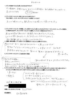 生徒さんたちの、のびのびとした明るい雰囲気(見学に来た、うちの子にまで、鬼ゴッコをしようと声をかけてくれたり・・・)と、先生の明るくサバサバした雰囲気が、見ていてとても楽しかった。質問4 ダンスサポートセンターに入会を決めた理由